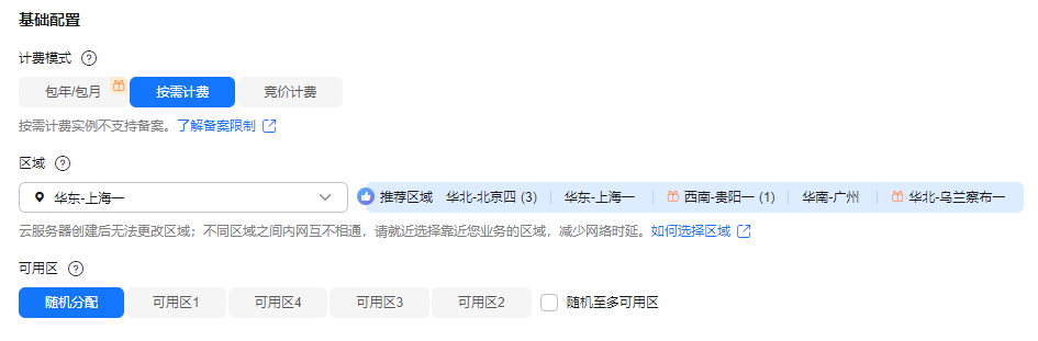 - 基础配置:如图1所示,本示例使用“按需计费”,区域选择“华东-上海一”。
