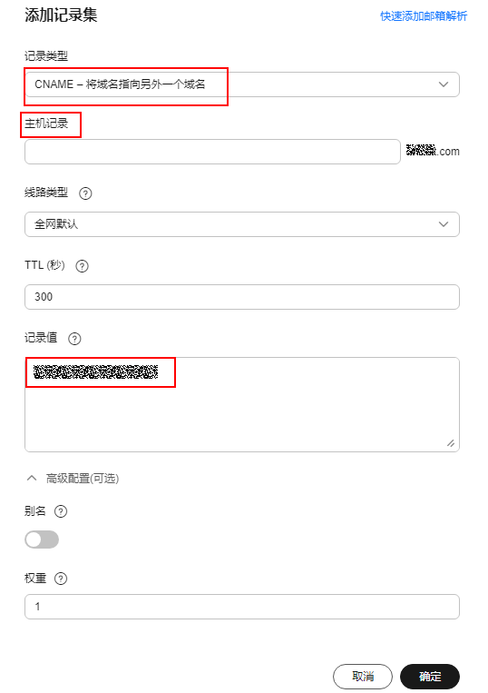 - 在右侧弹出的“添加记录集”窗口配置以下信息: