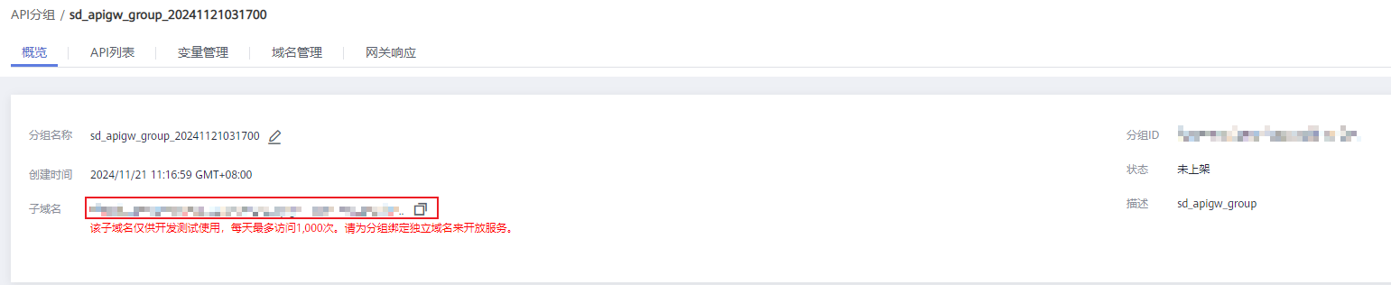 - 在弹出的api网关的管理控制台页面中,如图2所示,选择“概览”标签,单击复制“子域名”以备用。