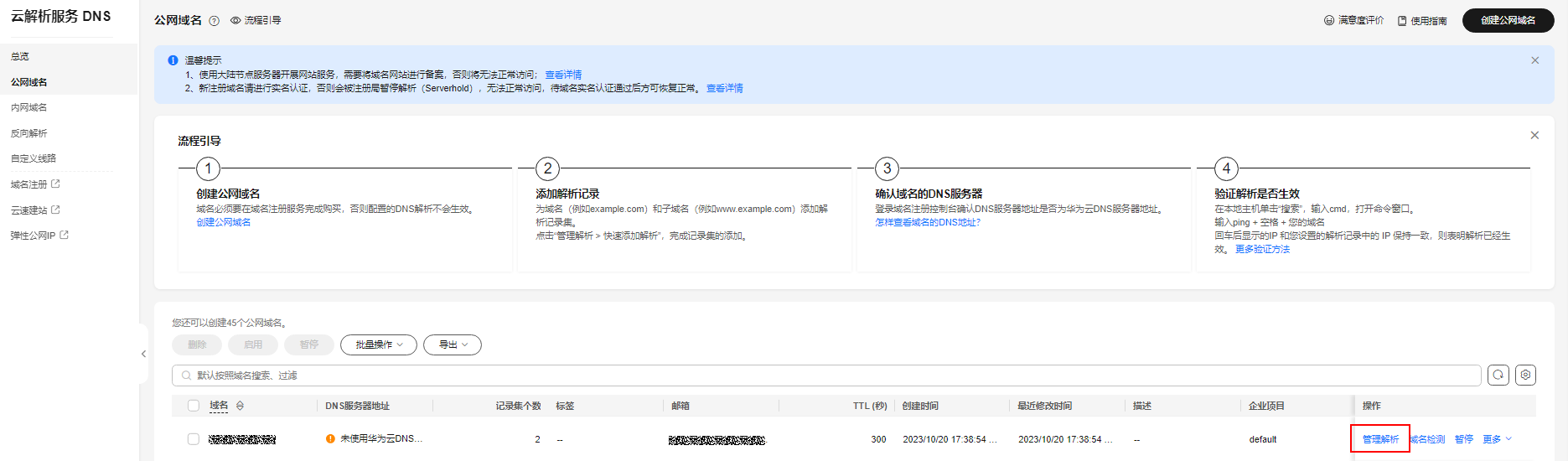 - 登录云解析服务dns控制台,如图3所示,选择“公网域名”页签,单击已购买的域名所在行右侧的“管理解析”。