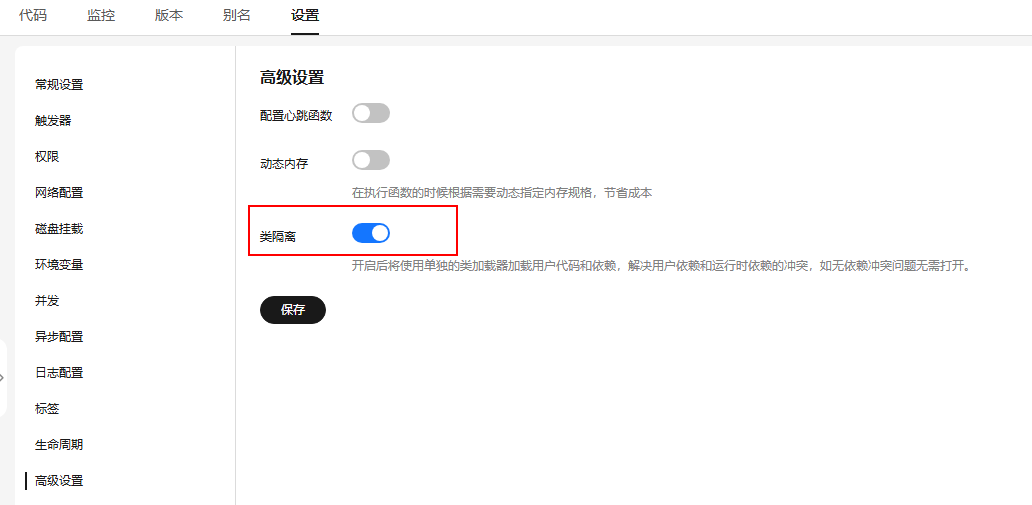 成功部署代码包后,如图1所示,选择“设置 > 高级设置”,开启“类隔离”,单击“保存”。图1 开启类隔离