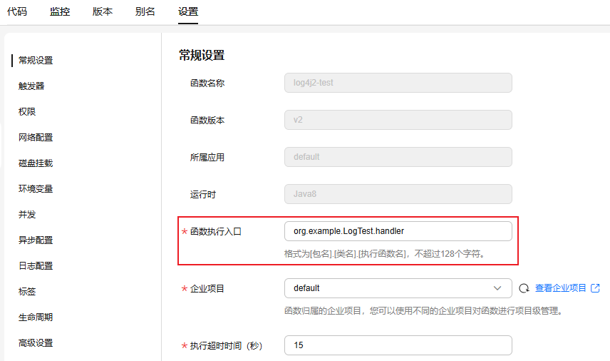 如图2所示,选择“设置 > 常规设置”,将“函数执行入口”参数设置为:org.example.logtest.handler,单击“保存”。