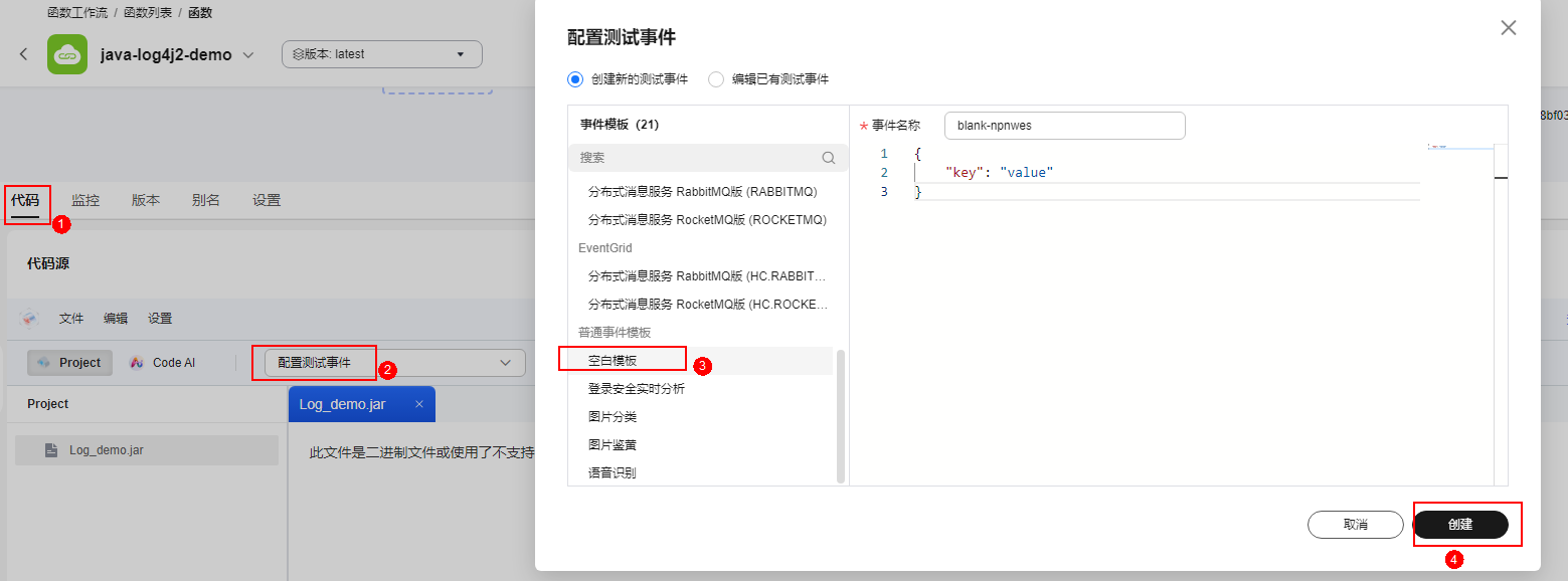- 配置完所有参数后,如图4所示,选择“代码”页签,单击“配置测试事件”,默认使用“空白模板”,单击“创建”。