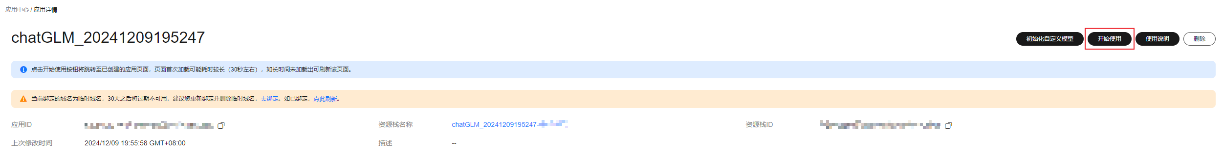 - 如图3所示,单击应用详情界面的“开始使用”,进入chatglm3 webui界面。首次加载冷启动时间会持续30s左右,请耐心等待,如遇到加载超时问题,可以通过刷新页面解决。