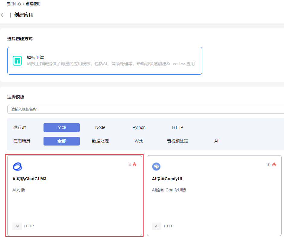 本章节介绍如何通过函数工作流控制台部署ai对话chatglm3应用。部署成功后,即可使用内置默认模型和临时域名开始ai对话体验。