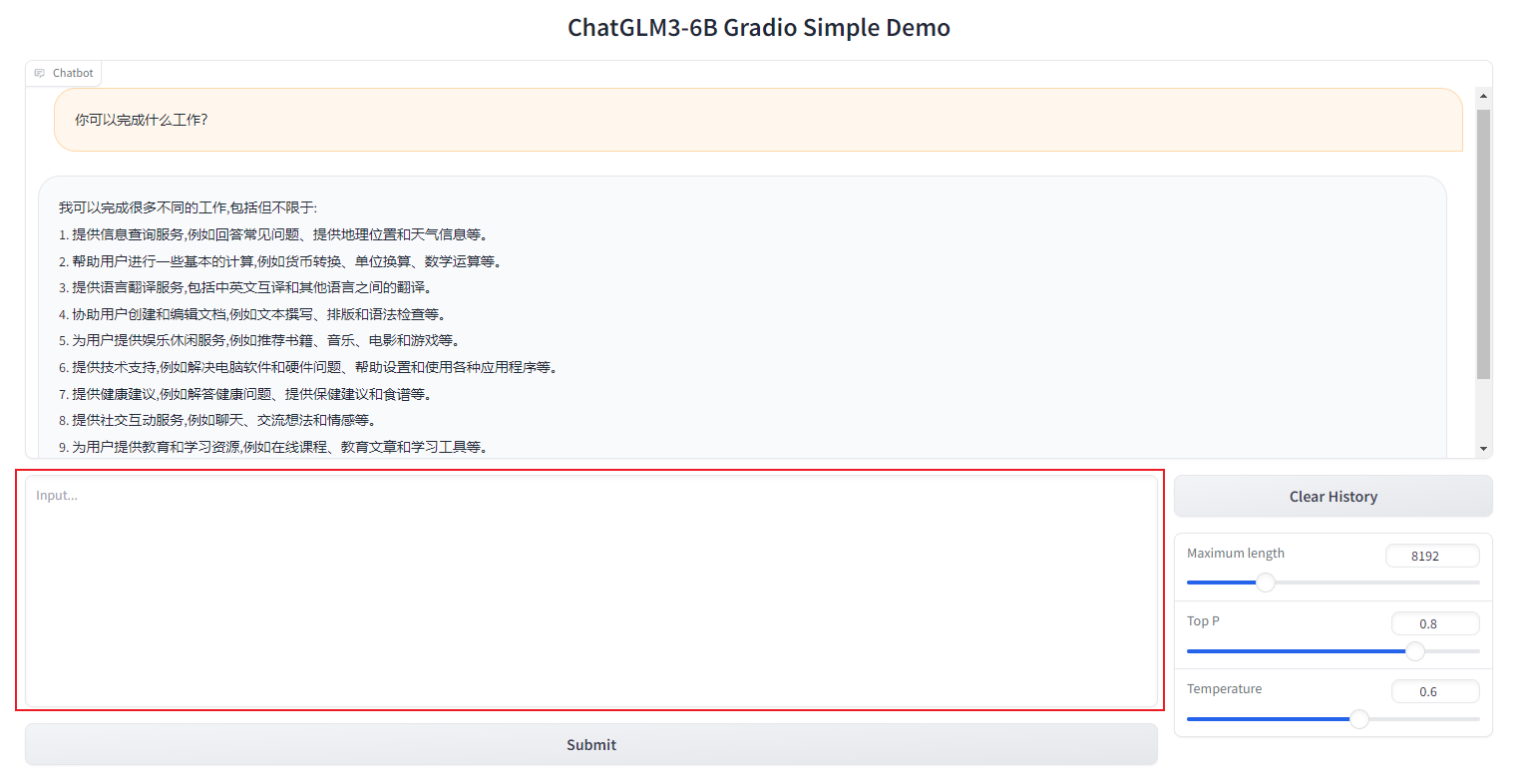- 本应用内置模型为chatglm3-6b大模型。如图4所示在文本框处输入文字(支持中英双语),单击下方的“submit”,即可开始与ai进行对话。