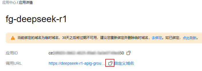 为方便快速体验,应用中心会为您分配一个临时域名,此临时域名仅可用于测试使用,有效期30天。若想开放应用长期访问,需在应用总览页面的域名提示信息中单击“去绑定”为应用绑定自定义域名,具体操作方案请参考。