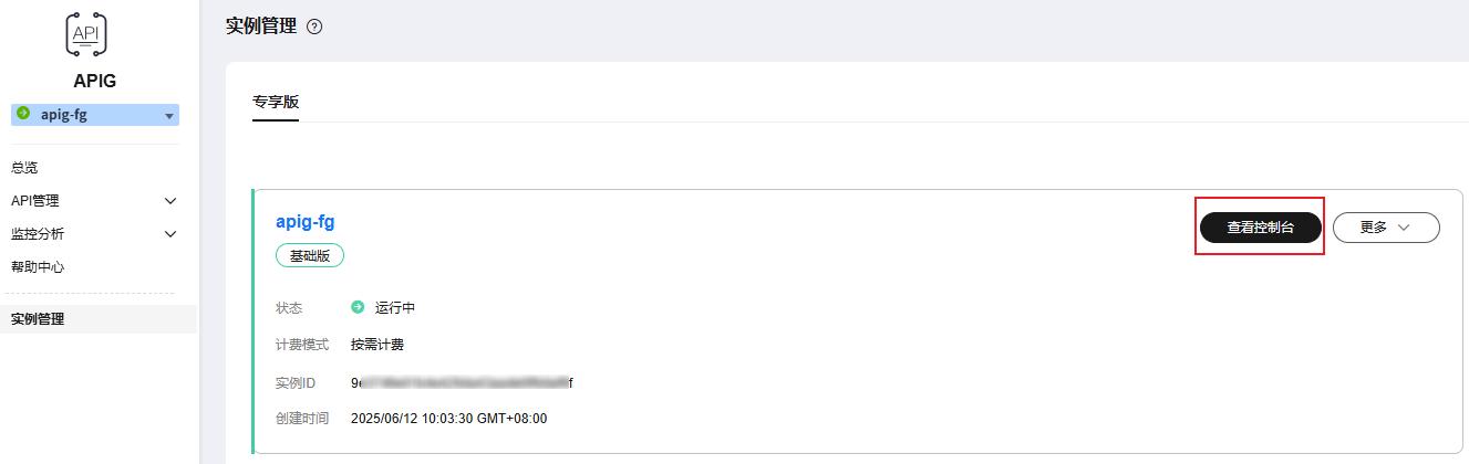 - 在apig控制台左侧导航栏选择“实例管理”,单击“查看控制台”。