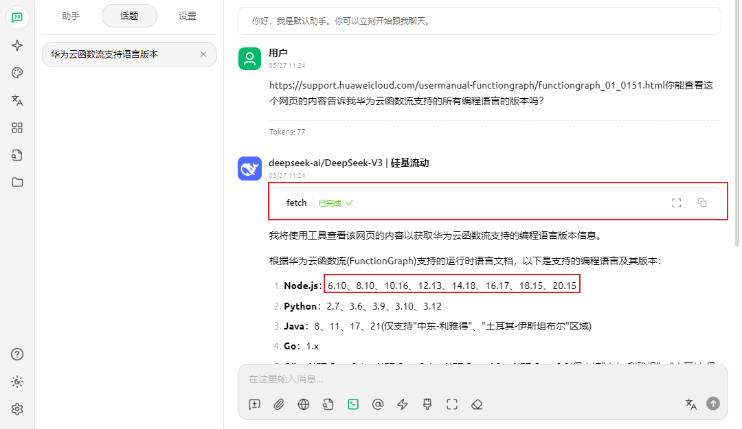 - 启用mcp服务器后再次对话,如图9所示,模型调用fetch工具读取官方文档链接内容后正确回答了问题。