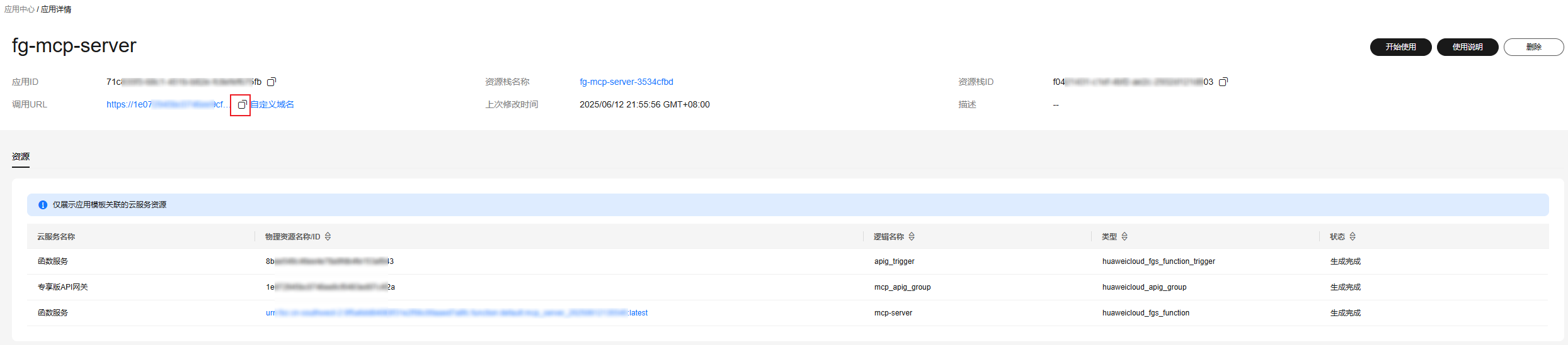 测试环境默认提供30天临时域名,实际生产环境请准备自定义域名并绑定使用。图4 mcp server应用