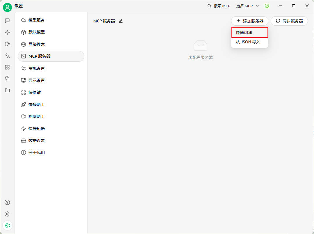 - 打开cherry studio客户端,进入设置界面,单击“mcp服务器”,选择“添加服务器 > 快速创建”。
