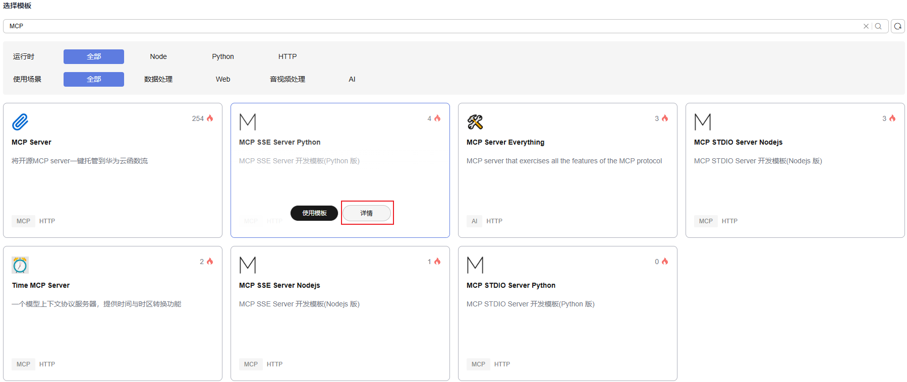 functiongraph应用中心提供了多类热门的mcp应用模板,助力您在functiongraph上迅速开发mcp相关业务。可单击模板的“详情”查看使用说明。