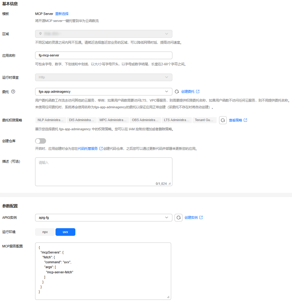 - 当前使用functiongraph应用中心部署mcp server应用仅限于“西南-贵阳一”和“华北-北京四”区域,请确保该实践中的相关资源均部署于该区域。