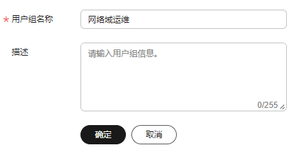 - 在“创建用户组”界面,输入“用户组名称”为“网络域运维”,单击“确定”。用户组名称只能包含中文、大小写字母、数字、空格或特殊字符(-_)。