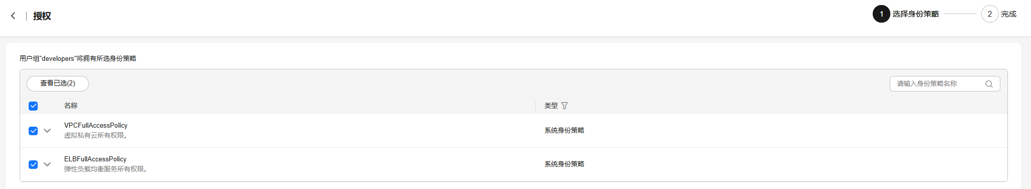 - 在搜索框中搜索“vpcfullaccesspolicy”和“elbfullaccesspolicy”,勾选并单击“确定”。