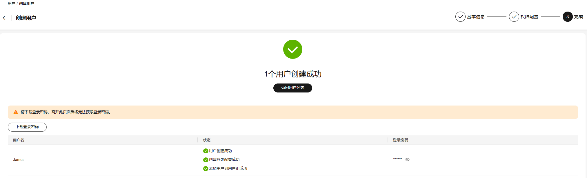 - 单击“创建创建用户”,iam用户创建完成,此时可以下载登录密码。