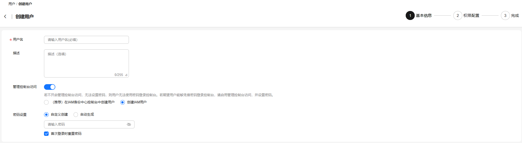 在“创建用户”界面填写“用户名”、“描述”和“管理控制台访问”,并设置密码。图8 配置用户信息