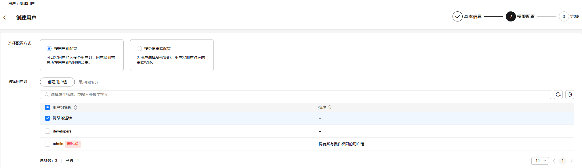 - 单击“确定”,完成对“网络域运维”用户组的授权。创建成功的用户组将会展示在用户组列表中。