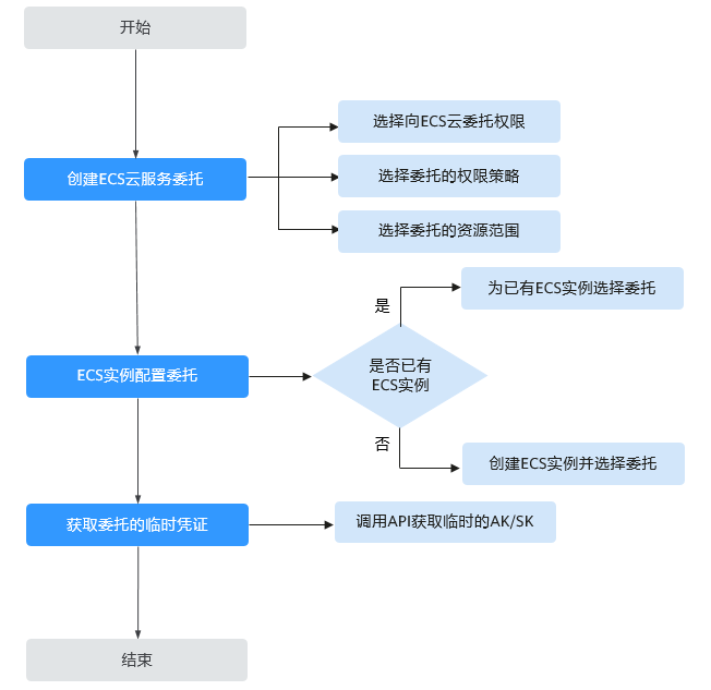通过ecs委托获取临时访问密钥的操作流程如下图所示。详细操作步骤请参见操作指导。图2 通过ecs委托获取临时访问密钥的操作流程