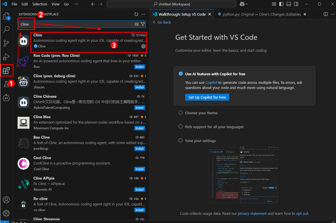 图标,在搜索框中输入“cline”,然后单击“install”。