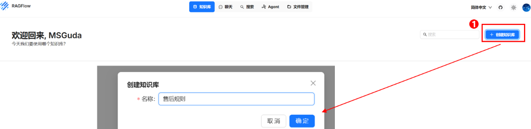 - 在ragflow顶部导航栏,单击“知识库”,在右上角单击“创建知识库”,输入名称,单击“确定”。