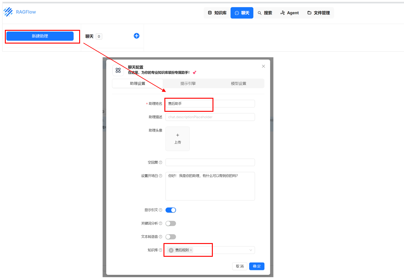 - 在“聊天”页面,单击“新建助理”,在“聊天配置”对话框,自定义助理姓名,选择已创建的知识库,然后单击“确定”。