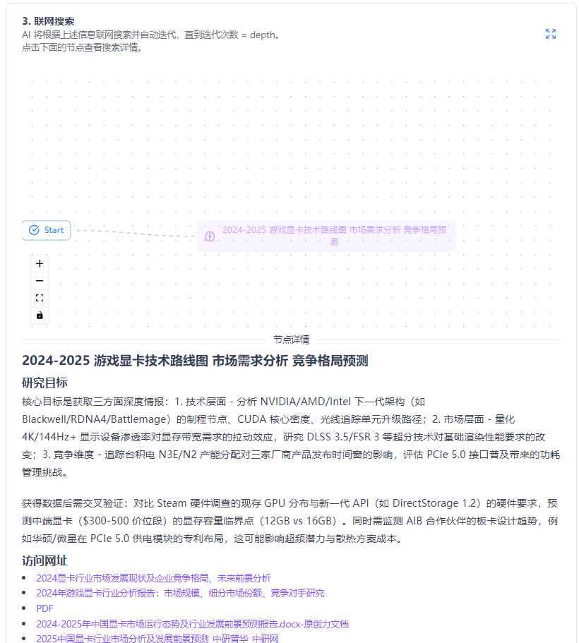 - 模型会根据用户的回答生成一个工作流,展示研究的具体流程和目标,然后模型会调用tavily ai的联网搜索接口获取相关的信息。您可以单击节点查看搜索详情。