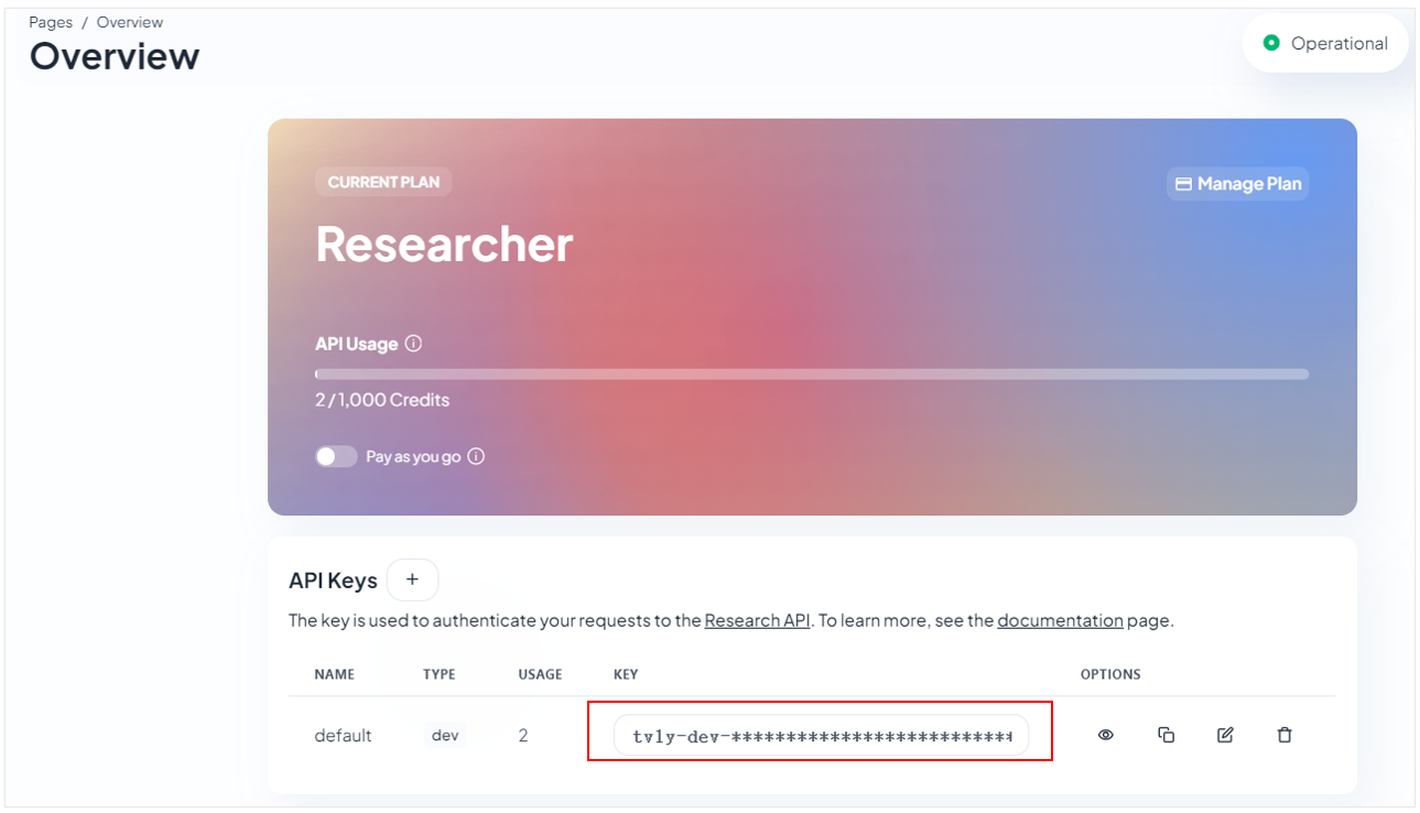 - 在“overview”页面的“api keys”区域获取api key,在后续deep research配置中使用。
