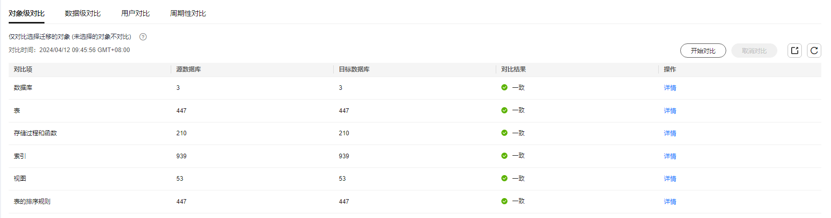 - 默认在“对象级对比”页签,单击“开始对比”,查看源库和目标库中库、表、索引等对比项的对比结果。