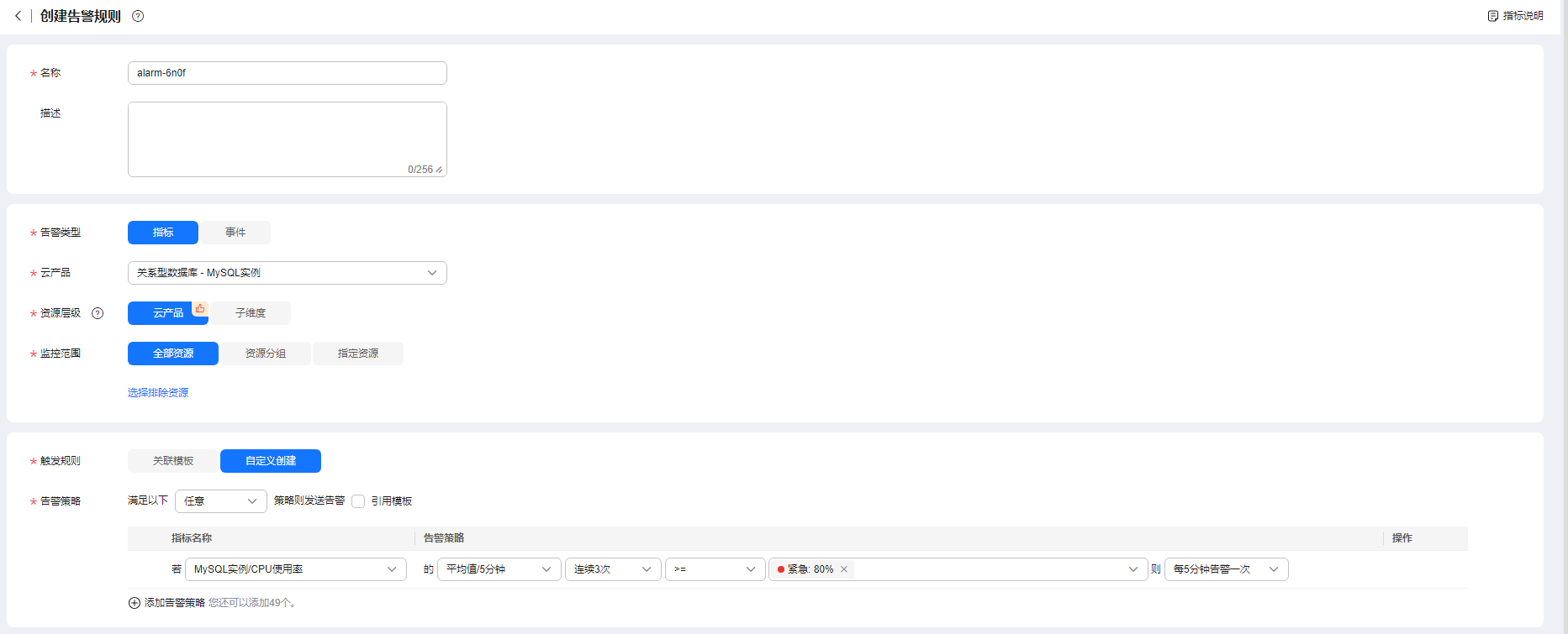说明:告警规则内最多可添加50条告警策略,若其中一条告警策略达到条件都会触发告警。