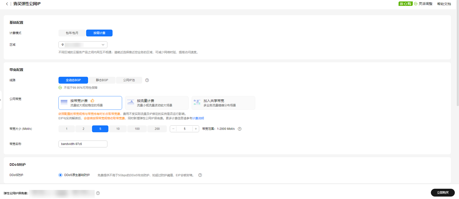 - 在“购买弹性公网ip”页面,选择区域“华东-上海一”。根据界面提示完成基本信息和带宽配置。