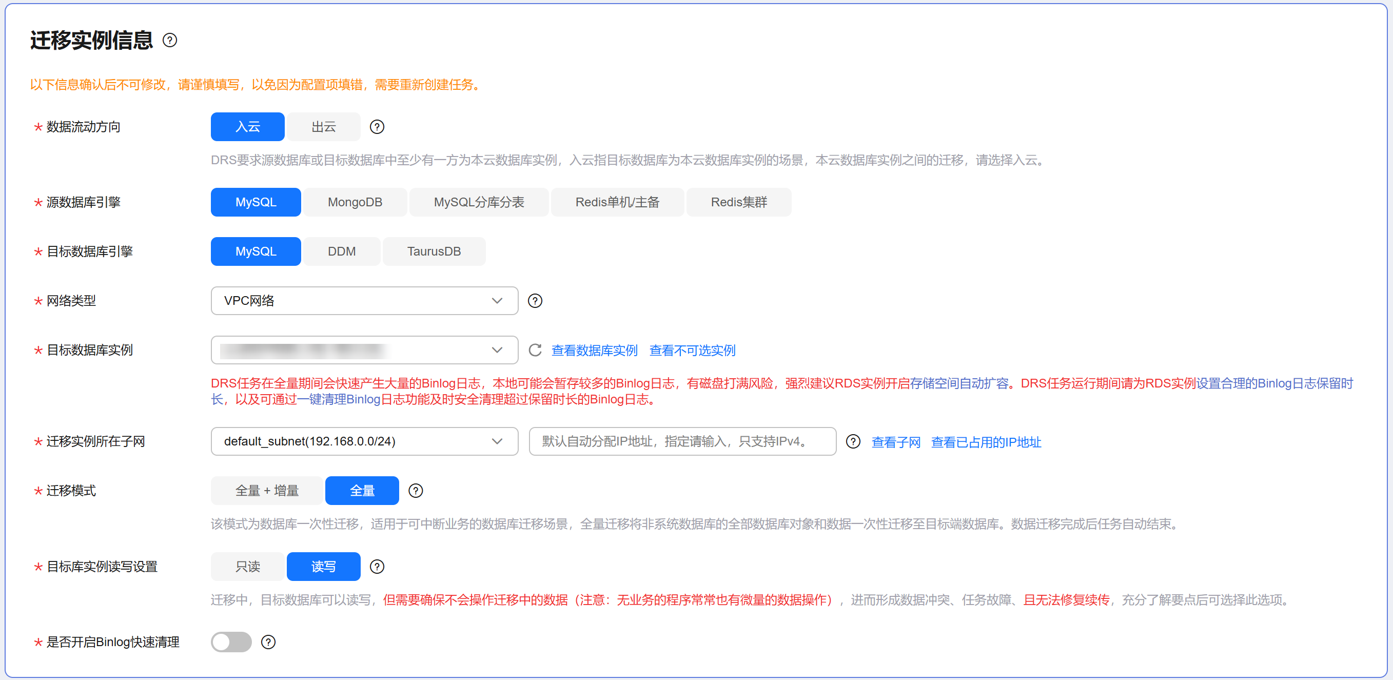 选择是否开启目标数据库实例binlog快速清理功能。开启后,drs任务运行期间,全量阶段目标数据库实例会开启binlog快速清理,增量阶段目标数据库实例会关闭快速清理。
