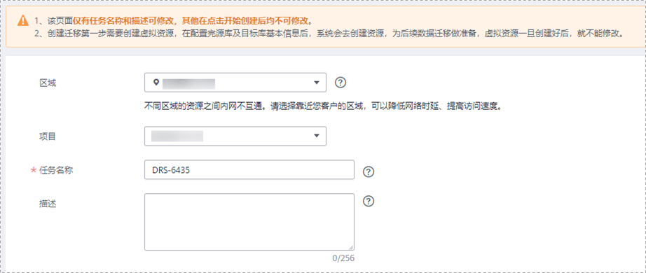 - 配置迁移任务名称。选择区域,即为目标实例所在的区域。