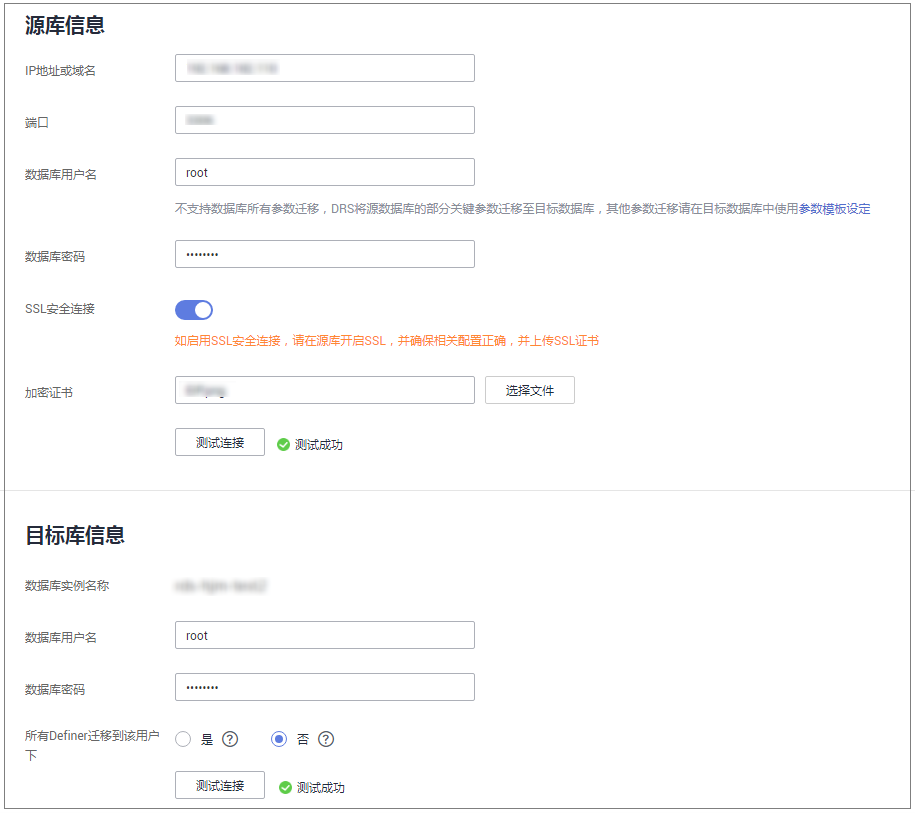 如启用ssl安全连接,请在源库开启ssl,并确保相关配置正确后上传ssl证书。