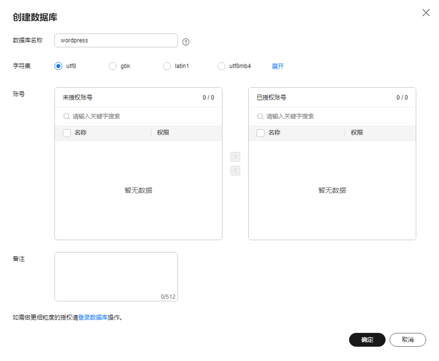 - 选择“数据库管理”页签,单击“创建数据库”,在弹出框中输入数据库名称,以“wordpress”为例,选择字符集并授权数据库账号,单击“确定”。