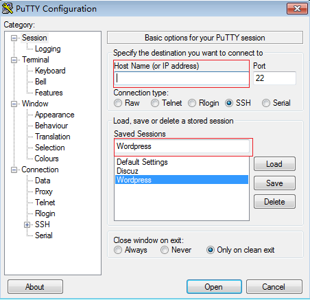 - 在“saved sessions”中输入名称,此处以wordpress为例,单击“save”,保存会话配置。