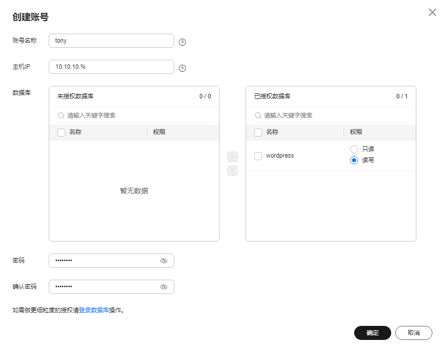 - 选中“账号管理”页签,单击“创建账号”。在“创建账号”弹出框中,输入数据库账号,以“tony”为例,授权数据库选择步骤3中创建的“wordpress”数据库,并输入密码和确认密码,单击“确定”。