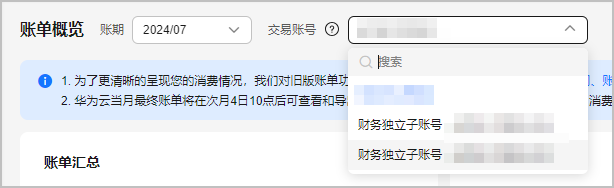 - 在“交易账号”下拉框中选择自身账号或需要查看的企业子账号,华为云展示相关消费数据。
