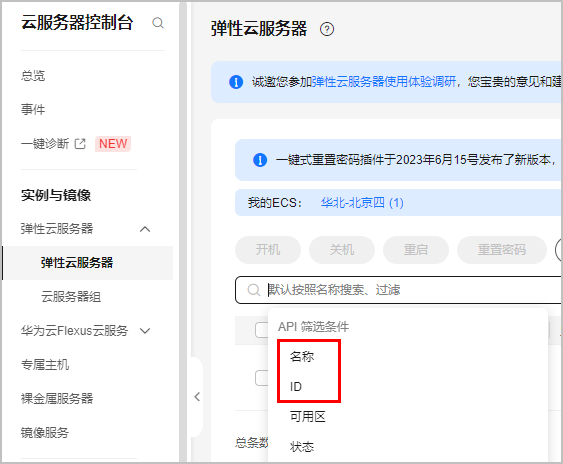 登录,选择资源所在区域后,在搜索框内单击鼠标左键,选择“名称”或“id”,将步骤1中复制的资源名称或id粘贴到搜索框内,查找具体资源。