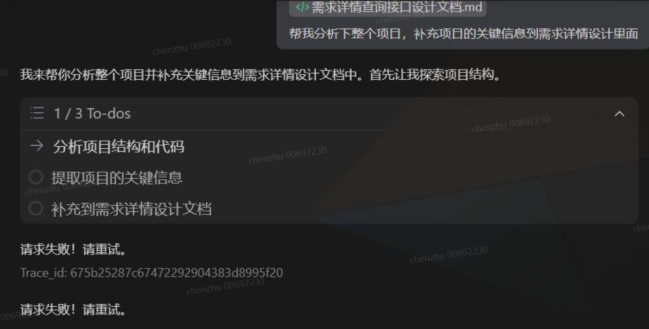当您调用codearts代码智能体时,可能出现如下报错:trace_id: 675b25287c67472292904383d8995f20 请求失败!请重试。