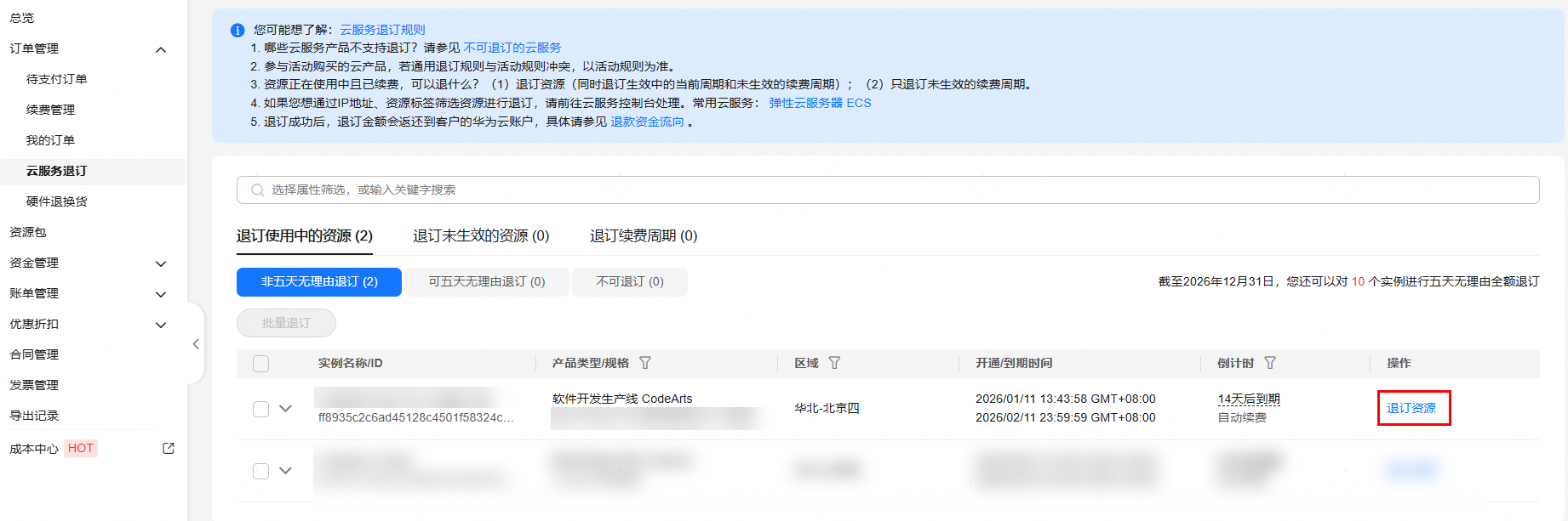 - 进入页面,单击codearts代码智能体所在行的“退订资源”。