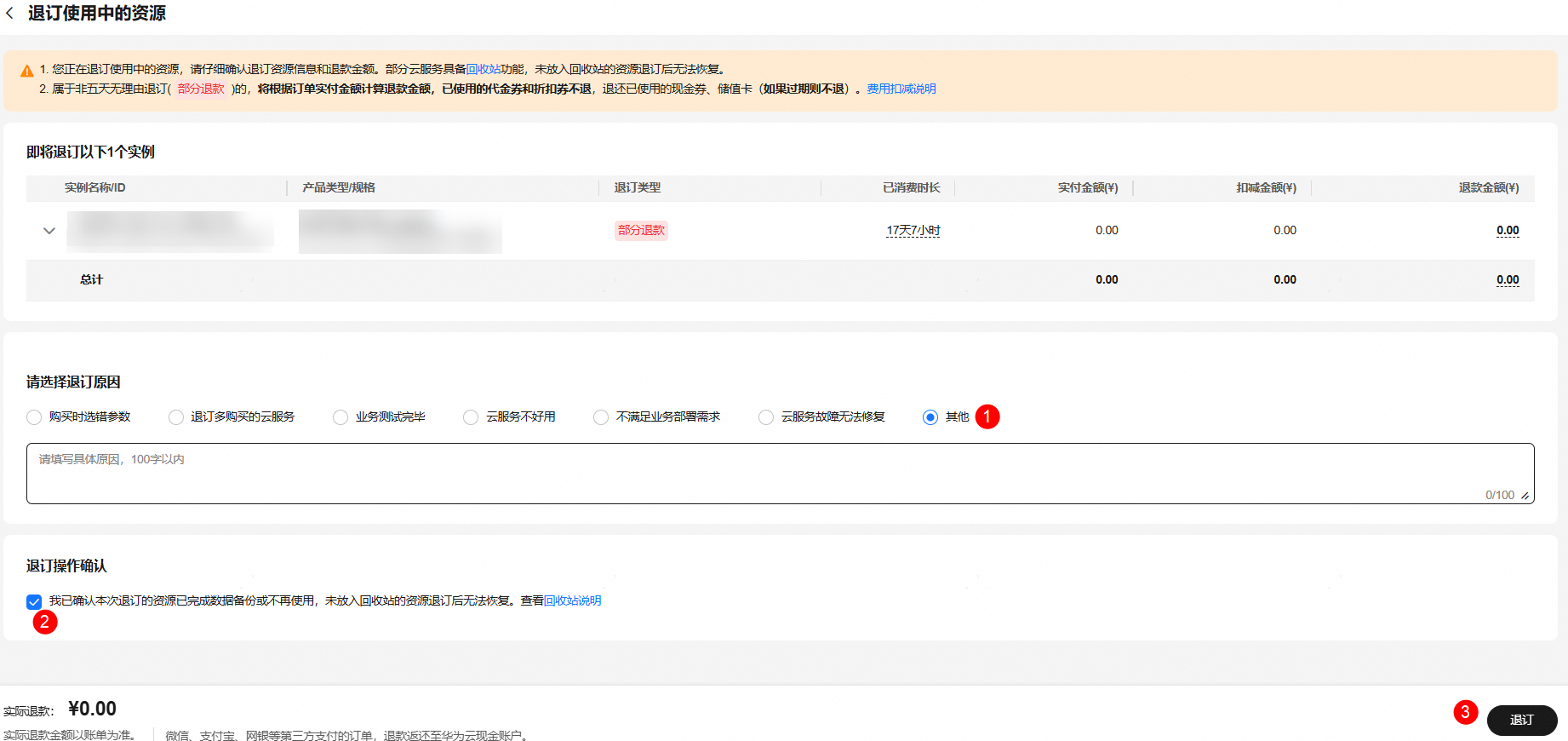 - 如下图所示,勾选“退订原因”和“退订操作确认”后,单击“退订”。