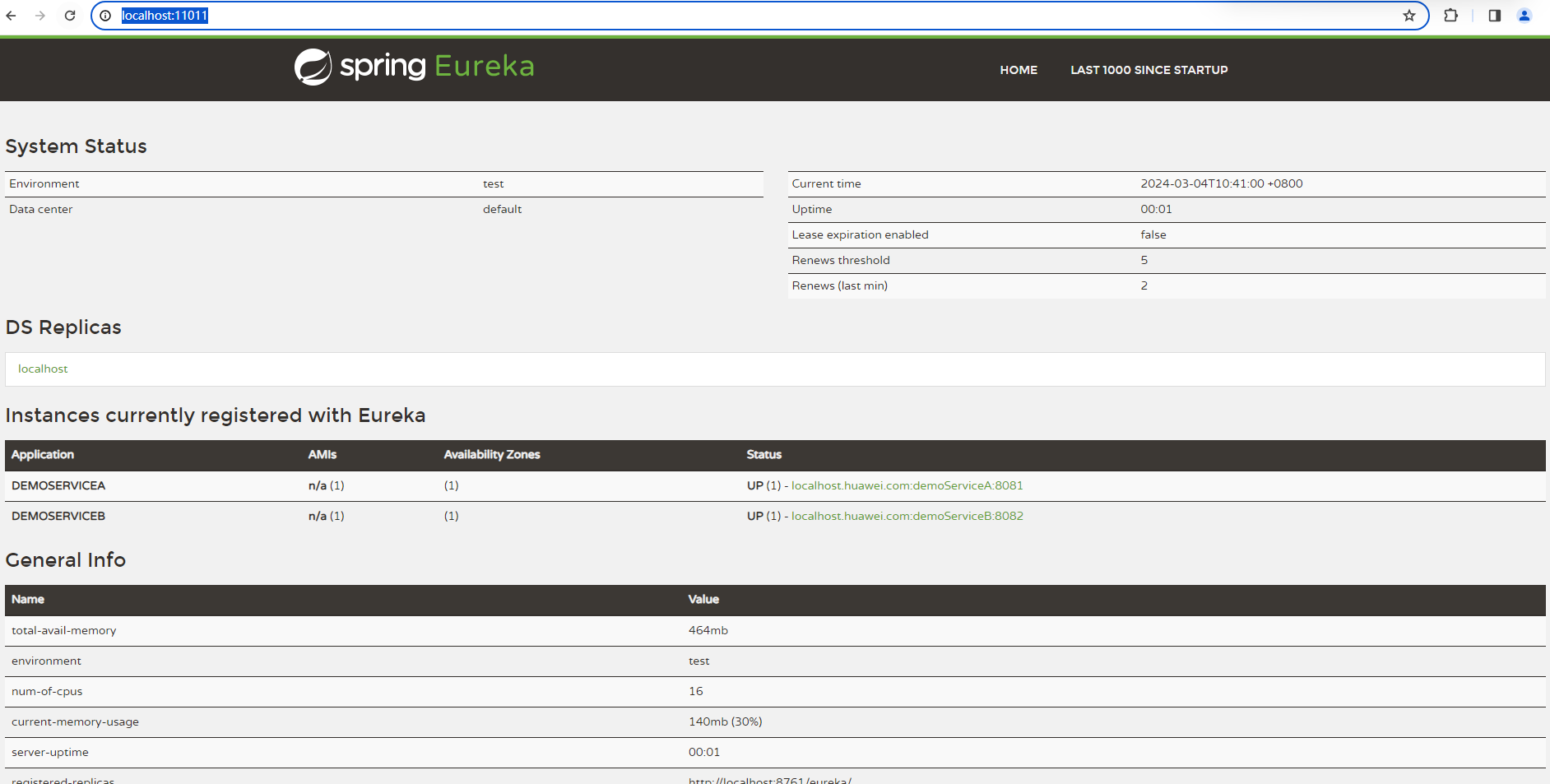 eureka: client: service-url: defaultzone: http://localhost:11011/eureka/ - 依次启动eureka、demoservicea、demoserviceb,访问http://localhost:11011/,可以看到demoservicea、demoserviceb的信息。