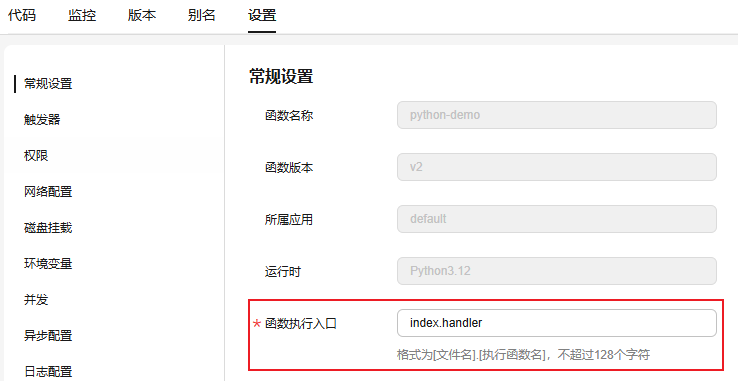 在functiongraph控制台左侧导航栏选择“函数 > 函数列表”,单击需要设置的“函数名称”进入函数详情页,选择“设置 > 常规设置”,配置“函数执行入口”参数,如图4所示。图4 函数执行入口