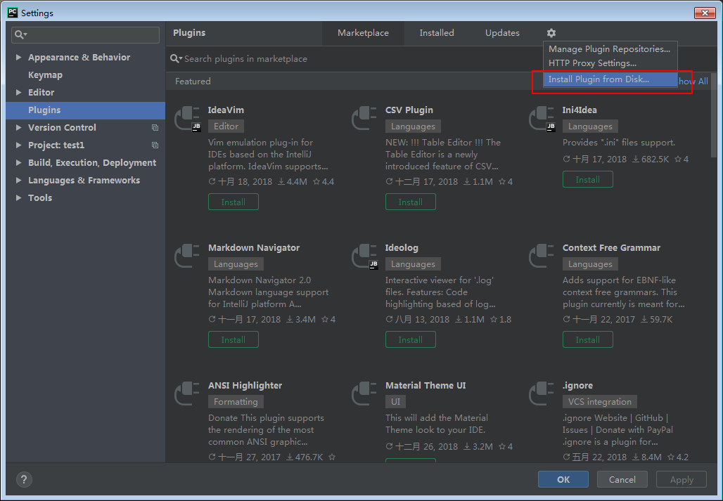 - 打开jetbrains pycharm,单击“file”菜单,选择“settings ”,在弹出界面的菜单中选择“plugins”页面,单击右上角设置按钮中的“install plugin from disk... ”,如图1所示。