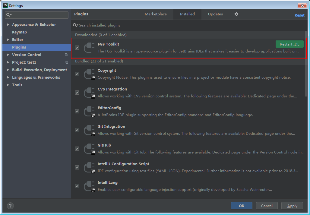 - 在插件列表中,勾选插件名称,单击“restart ide”,如图3所示。