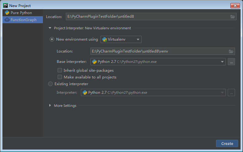 - 在“location”栏中选择工程的路径 ,在“project interpreter: new virtualenv environment”中选择使用python的版本。如图6所示。