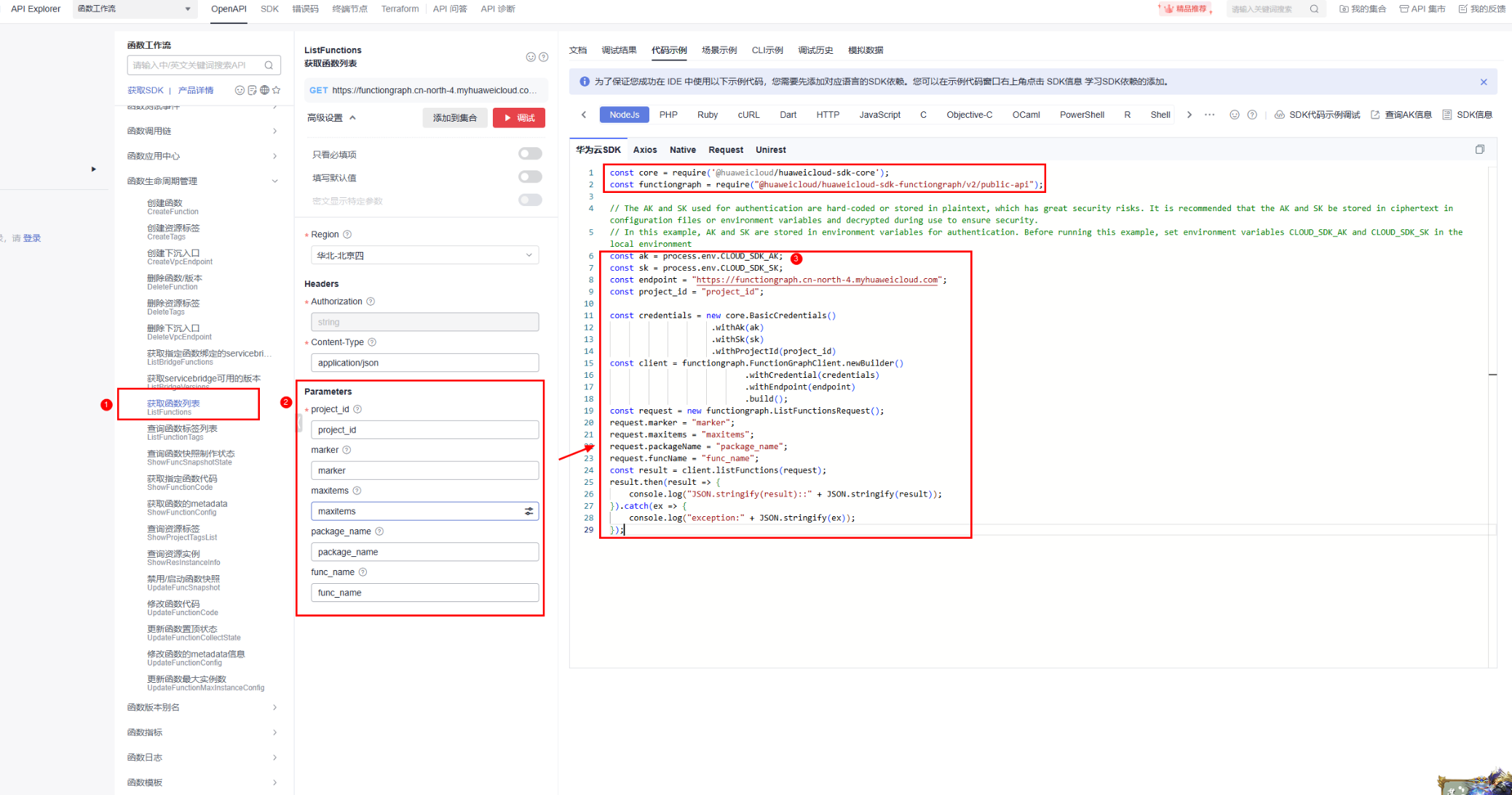 本章节以“获取函数列表”接口为例指导您使用华为云sdk,在函数工作流控制台开发node.js函数。