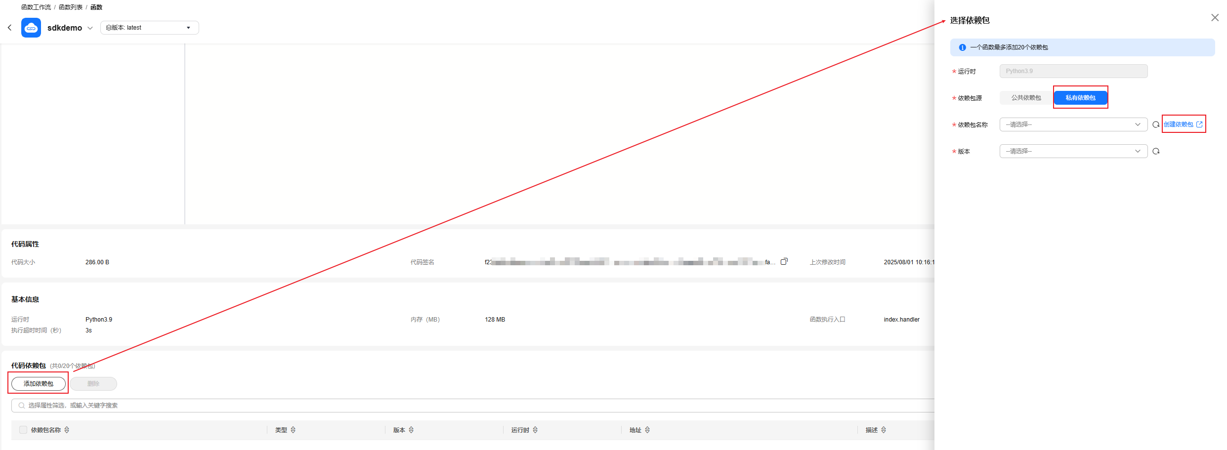 - 在“代码”页签,下拉至“代码依赖包”模块,单击“添加依赖包”。