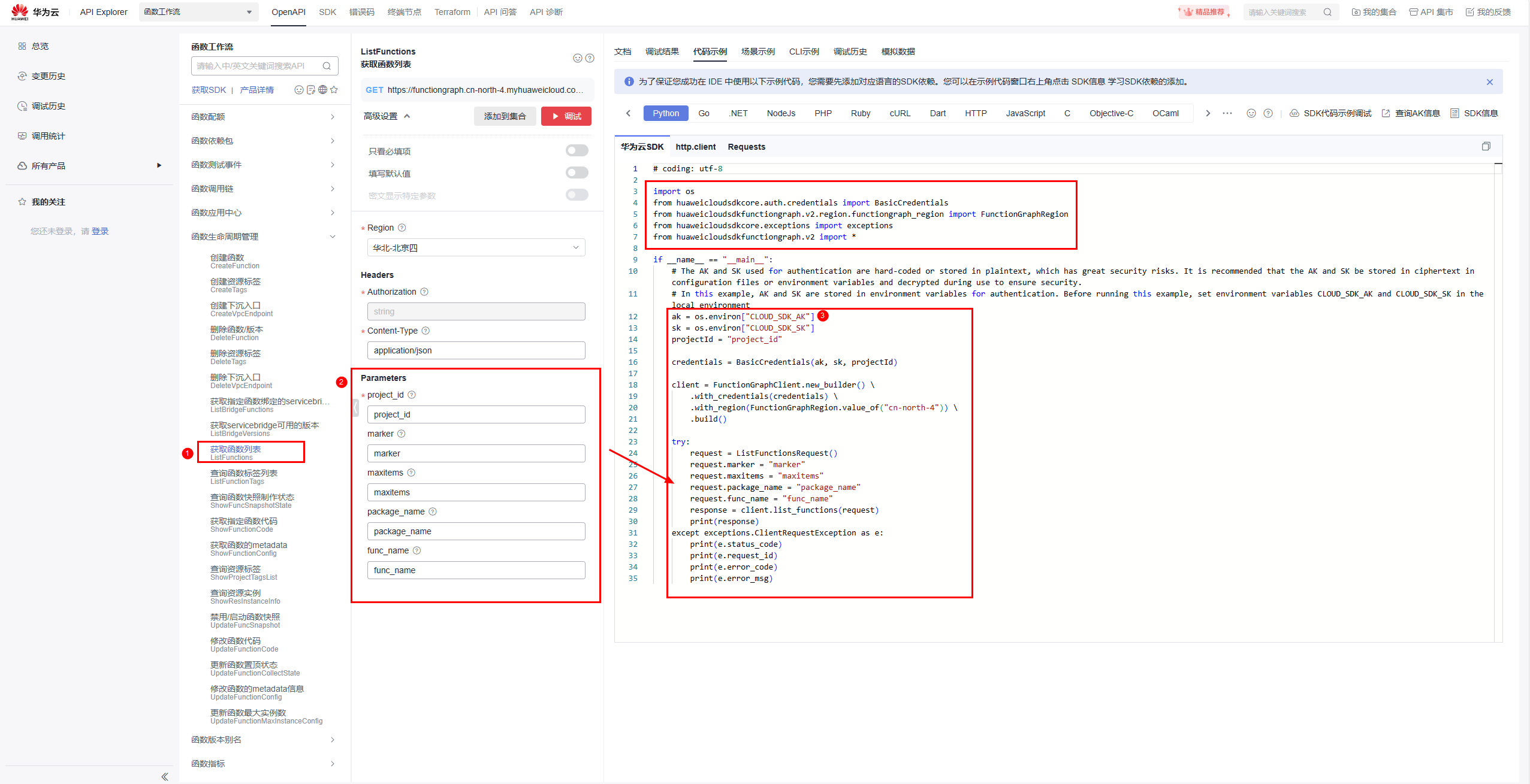 本章节以“获取函数列表”接口为例指导您使用华为云sdk,在函数工作流控制台开发python函数。